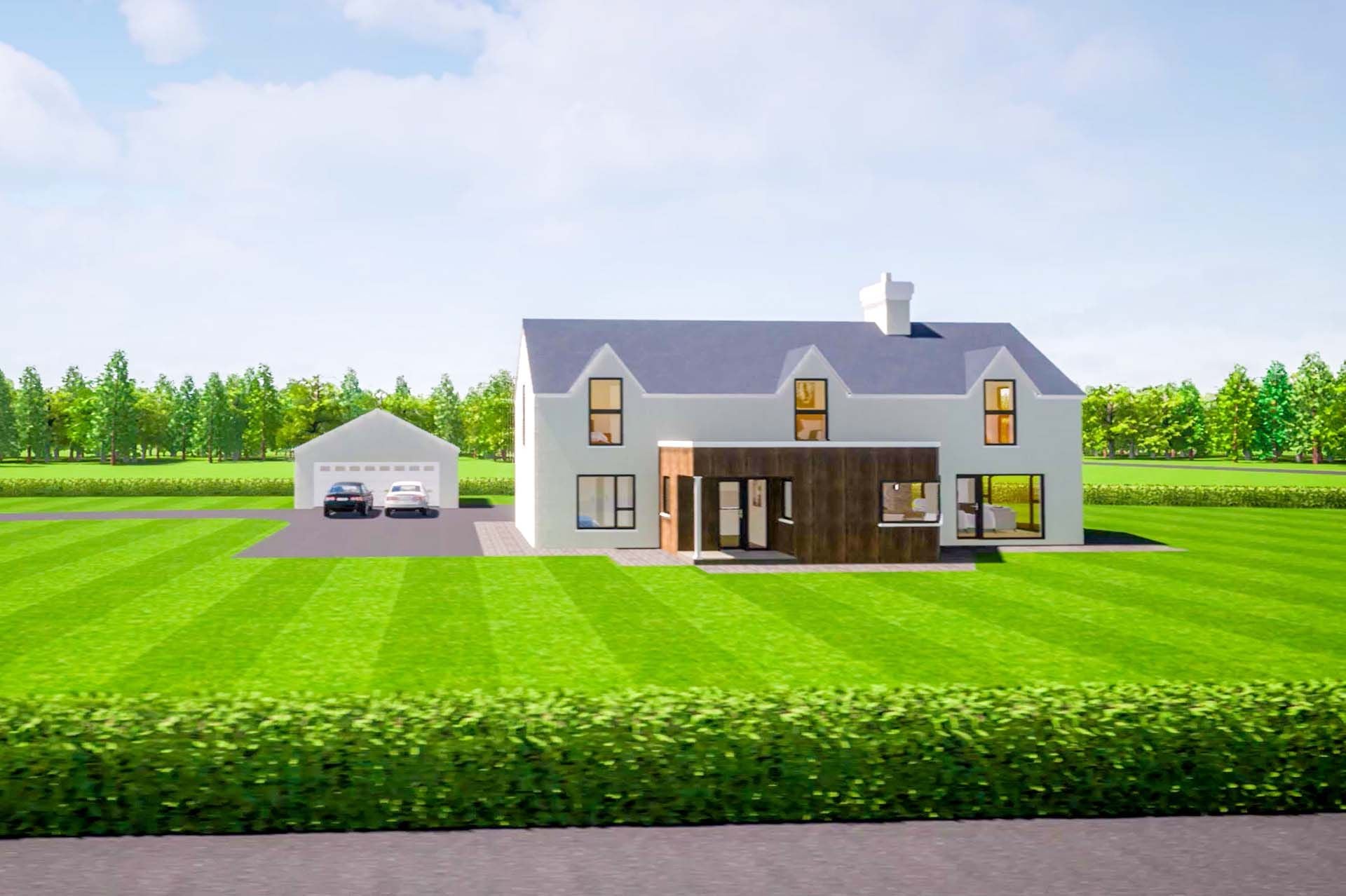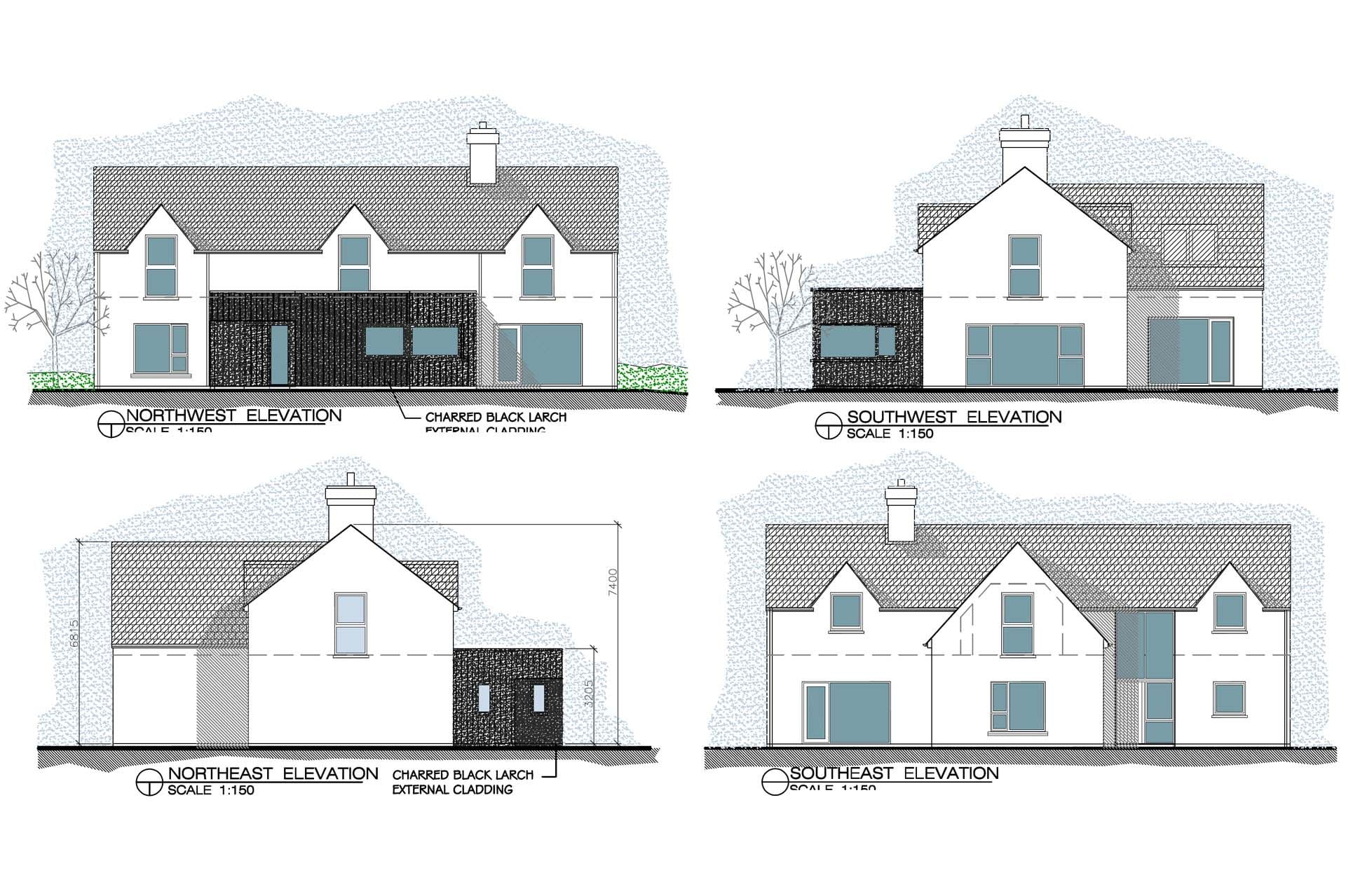 Offered with the benefit of full planning permission, the site allows for the construction of a striking architect-designed four-bedroom residence extending to almost 3,000 sq. ft., complemented by a detached double garage. The approved design is both elegant and contemporary, thoughtfully composed to sit comfortably within its surroundings while maximising light, aspect and connection to the outdoors. The house artfully pairs traditional gabled silhouettes with the sophisticated texture of charred black larch cladding, creating a home that is as visually compelling as the headland itself. Generous glazing, clean lines and a refined palette of materials combine to create a home of real architectural presence, with a layout designed for modern family living, including expansive open-plan reception spaces and well-balanced bedroom accommodation.